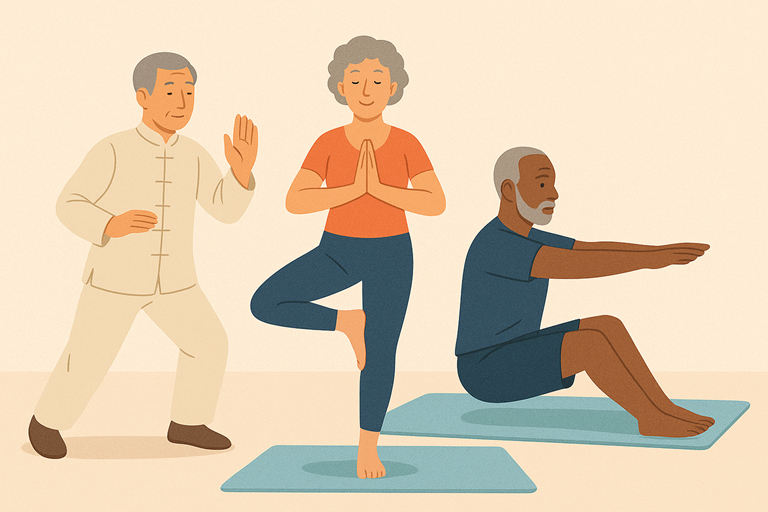 Yoga is frequently grouped with Tai Chi in research as a “multidimensional” practice, meaning it integrates balance, strength, flexibility, and mindfulness. While fewer studies examine yoga alone, the umbrella review shows that holistic exercise programs—those combining these elements—consistently reduce fear of falling.